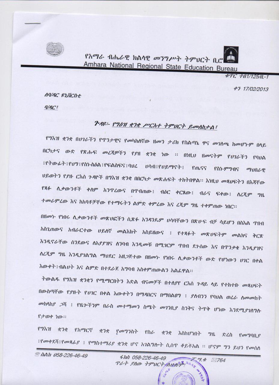 የግዕዝ ቋንቋ በትምህርት ስርዓቱ ውስጥ ለማካተት የሚያስችለውን የቅድመ ዝግጅት ስራ እየሰራ መሆኑን የአማራ ክልል ትምህርት ቢሮ ገልጸ፡፡ ቢሮዉ የባህርዳር ዩኒቨርስቲ ያሉትን ባለሙያዎች በማስተባበርና በማቀናጀት ተገቢውን ድጋፍና ትብብር እንዲያደርግለት ጠይቋል፡፡