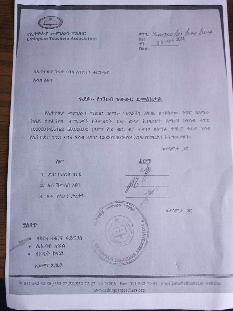 የኢትዮጵያ መምህራን ማህበር በአሸባሪው የህወሃት ቡድን ወረራ ምክንያት በክልላችን ከአካባቢያቸው የተፈናቀሉ ህጻናት ከትምህርት ገበታ ውጭ እንዳይሆኑ የመማሪያ ቁሳ ቁስ መግዣ የሚሆን ሃምሳ ሽህ ብር ድጋፍ አድርጓል፡፡ የኢትዮጵያ መምህራን ማህበር ላደረገው ድጋፍ በህጻናቱ ስም እናመሰግናለን፡፡