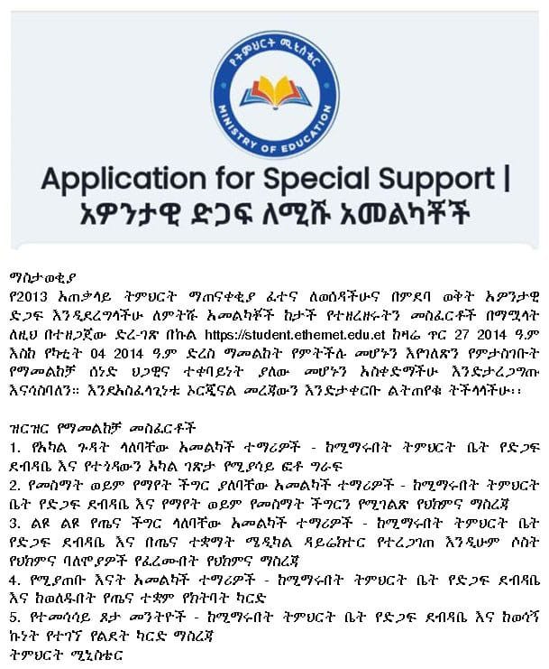 በ2014 ዓ.ም የአጠቃላይ ትምህርት ማጠናቀቂያ ፈተና ለወሰዱና አዎንታዊ ድጋፍ ለሚሹ ተማሪዎች የማመልከቻ መስፈርቶች