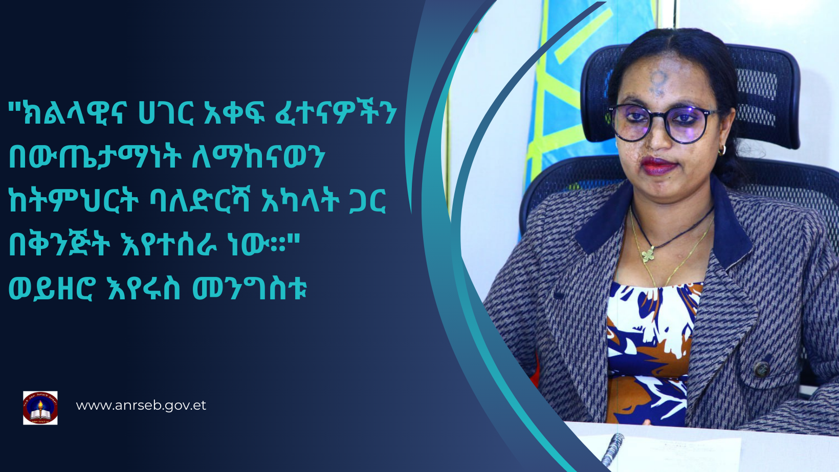 የአማራ ክልል ትምህርት ቢሮ ምክትል ኃላፊ ወይዘሮ እየሩስ መንግስቱ በቀጣይ ጊዜያት የሚሰጡ ክልላዊና ሀገር አቀፍ ፈተናዎችን በውጤታማነት ለማከናወን ከትምህርት ባለድርሻ አካላት ጋር በቅንጅት እየተሰራ መሆኑን አመላክተዋል።