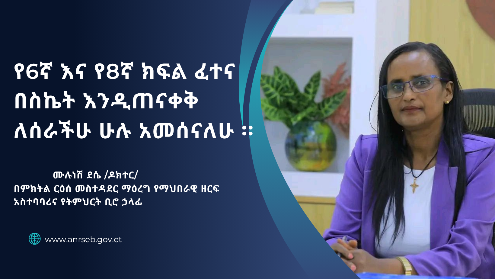 በምክትል ርዕሰ መስተዳደር ማዕረግ የማህበራዊ ዘርፍ አስተባባሪና የትምህርት ቢሮ ኃላፊ ሙሉነሽ ደሴ /ዶክተር/ የ8ኛ እና የ6ኛ ክፍል ፈተና በሰላም መጠናቀቁን አስመልክቶ የሚከተለውን የምስጋና መልዕክት አስተላልፈዋል፡፡
